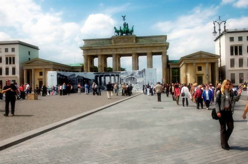 Hier zie je de grote Brandenburger Tor van Berlijn. Ervoor staat een oude foto ervan.