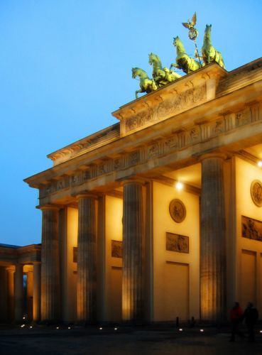 Hier zie je een stuk van de Brandenburger Tor in Berlijn in het schemerduister.