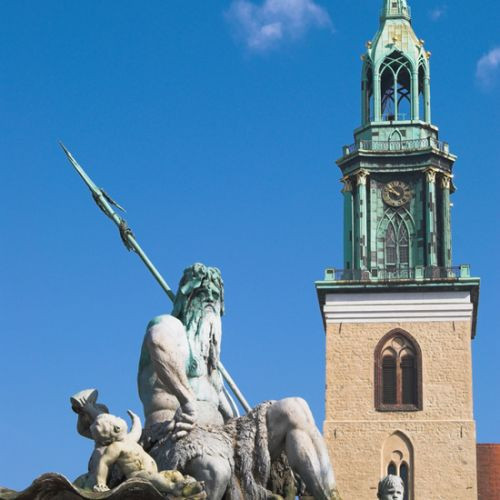 Hier zie je een standbeeld dat voor de toren van de St. Marienkirche in Berlijn staat.