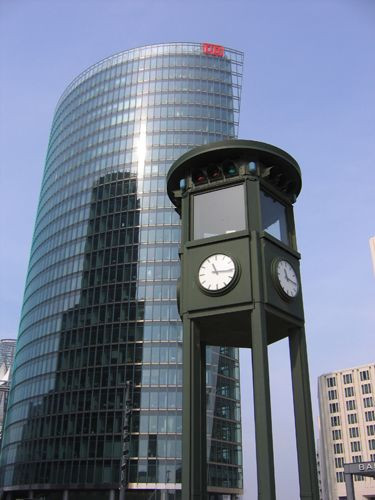 Hier zie je een klok die op de Potsdamer Platz in Berlijn staat.