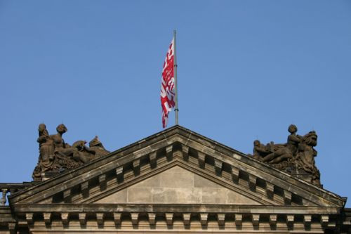Hier zie je het bovenste stuk van het Bode-Museum met bovenop een vlag.
