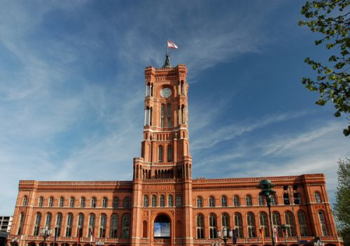 Hier zie je het Rotes Rathaus in zijn geheel. De bouwstijl haalde inspiratie uit de Italiaanse renaissance.