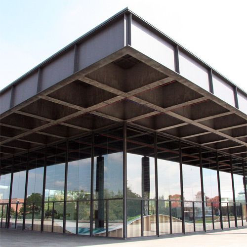 Hier zie je de glazen wanden van de Neue Nationalgalerie in Berlijn.