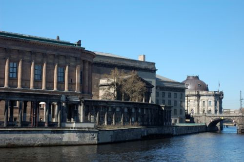Hier zie je de Alte Nationalgalerie van over het water. Dit gebouw is een museum in Berlijn.