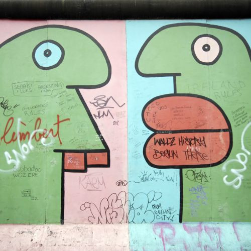 Hier zie je een stuk kunst op de Berlijnse Muur. Dit is een deel van de East Side Gallery.