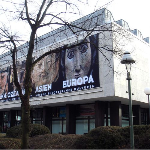 Dit is de voorkant van een museum in Berlijn dat een etnologische en folkloristische collectie tentoonstelt.