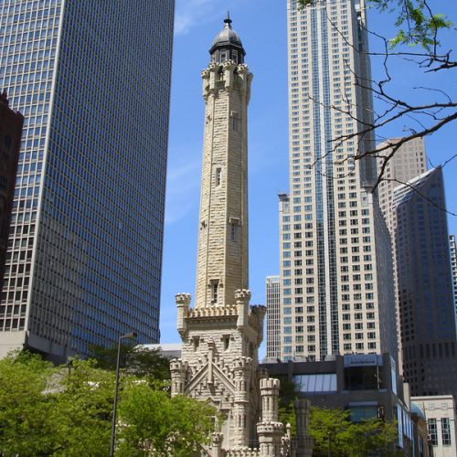 Deze toren is 47 meter hoog en is eens van de weinige gebouwen die de brand van 1871 in de stad hebben doorstaan.
