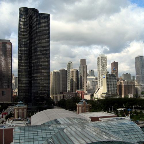 Het hoge zwarte gebouw links op de foto is de Lake Point Tower van Chicago. Dit is een appartementsgebouw van 196 meter.
