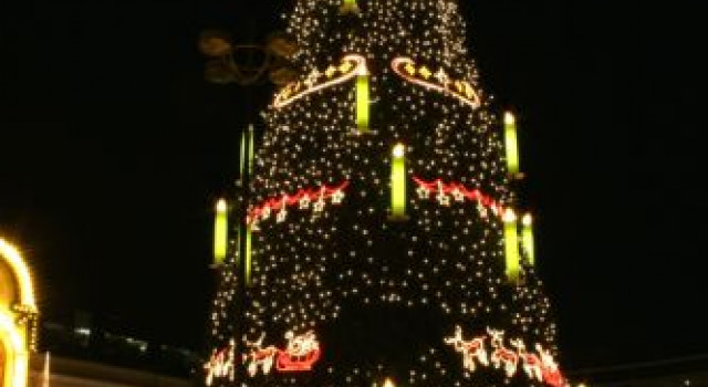 45 meter hoge kerstboom , zorgvuldig in elkaar geknutseld van 1700 kleinere bomen. Rond de groene reus worden 300 kraampjes zorgvuldig gebouwd met