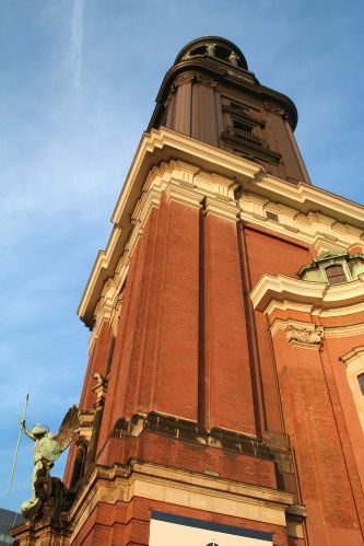 Deze foto is genomen onder aan de Sint Michaeliskirche van Hamburg. Ze is gebouwd in een barokke stijl.