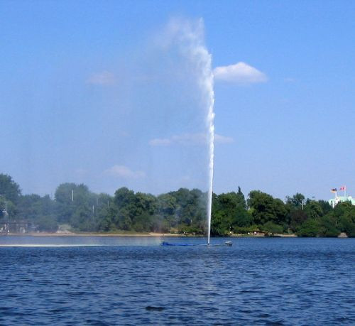 Deze fontein kan je bekijken in Hamburg. Ze ligt in een aangelegd meer.