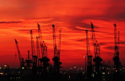 Hier zie je een mooi beeld van enkele kranen in de haven van Hamburg.