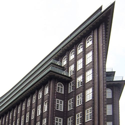 Hier zie je een scherpe hoek van het Chilehaus in Hamburg. Het is een ontwerp van Fritz Höger.