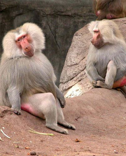 Deze twee bavianen zitten in het Tierpark Hagenbeck van Hamburg. Dit was de eerste zoo ooit die de dieren niet opsloot in kooien.