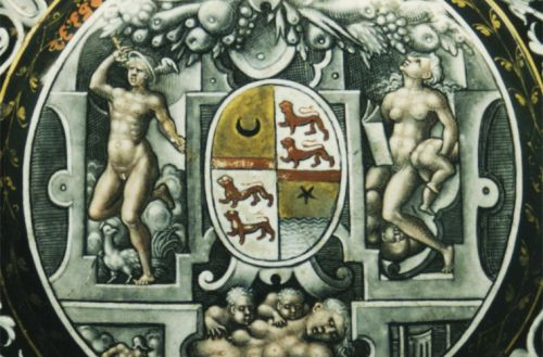 Dit is een wapenschild dat een kunstwerk is, tentoongesteld in het Museum für Kunst und Gewerbe in Hamburg.