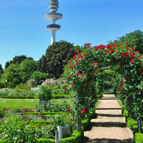 Je kan op deze foto een stukje van het grote park Planten un Blomen in Hamburg zien. Op de achtergrond zie je de Heinrich-Hertz-Turm.