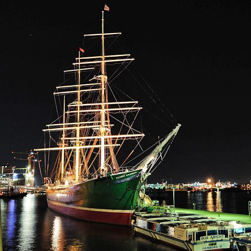 Deze foto werd 's nachts in de haven van Hamburg genomen. Je ziet hier het zeilschip Rickmer Rickmers dat is omgevormd tot museum.