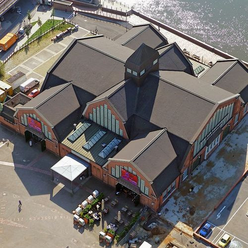 Deze foto werd vanuit de luchtballon langs deze Deichtorhallen in Hamburg genomen. Dit gebouw staat er sinds 1914.