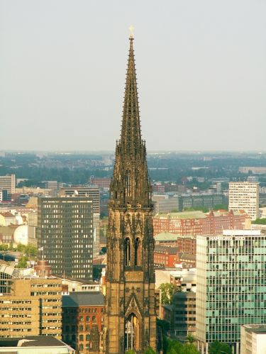 Op deze foto kan je de toren van de St.-Nikolai-Kirche die nog overblijft in Hamburg zien. De rest van de kerk ligt in puin.