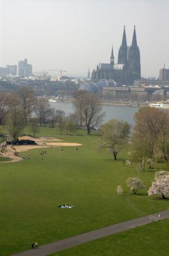 Dit is een luchtbeeld van boven het Rheinpark in Keulen, in de verte zie je de Rijn en de Dom.