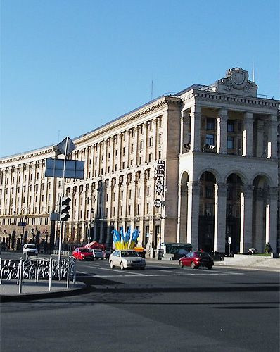 Dit is een foto van een gebouw dat langs de Kreschatyk in Kiev staat. Op deze straat reed de eerste elektrische tram van het Russische Rijk.