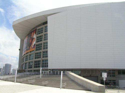 Dit is een beeld van de buitenkant van de American Airlines Arena in Miami. Deze zaal werd geopend in 1999.