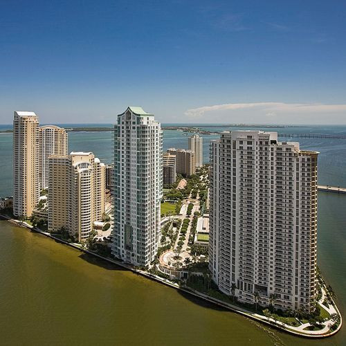 Je kan op deze foto de driehoekige vorm van het eiland Brickell Key bij Miami zien.