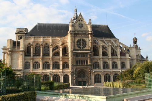 Dit is een beeld van de Saint-Eustache, een gotische kerk dichtbij Les Halles in Parijs.