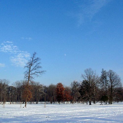 Een mooi beeld van een besneeuwde vlakte in het park Stromovka dat in het centrum van Praag ligt.